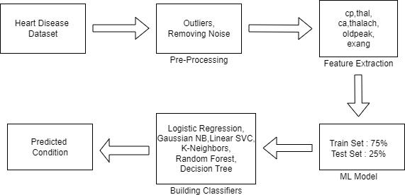 Thereareseveralclassifiersusedtodetectheartdiseasesuchaslogisticregression,GaussianNB,LinearSVC,DecisionTree,K Neighbours,andRandomForest.LogisticRegressionisasupervisedmachinelearningalgorithmthatisused tomodelthe probabilityofacertainclassoranevent.Itisusedwhenthedataislinearlyseparableanditsoutcomeisbinaryinnature.