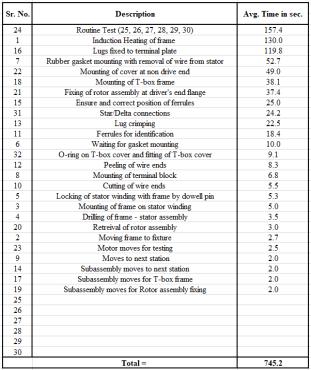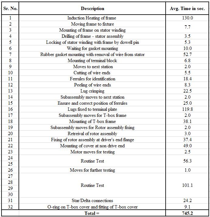 Fromthetimestudytable,weobservedthatthebottleneck operationwasinthelastfewsteps(i.e.,Timetakenfortesting operation). Description number 24, 25, 27, 28, 29 and 30 consistsoftestingoperations.24 IRTest(InsulationTest) ,25 HV Test (High Voltage) ,27 Resistance test ,28 Reduced Voltage test, 29 No load test, 30 LockedRotor test.Andallthesetestsaredoneintestingmachinewhichis denotedas‘RoutineTest’.Fromthetimestudytable,Number (24, 25) = 56.3 sec. and Number (27, 28, 29, 30) = 101.1 seconds. Therefore, the total time taken for the above mentioned will be: Number (24, 25, 27, 28, 29, 30) = (56.3+101.1) =157.4 sec. Now, 157.4 sec. is the greatest amongallthetimingsinthetable.Hence,thebottle neckof theassemblyisidentified.