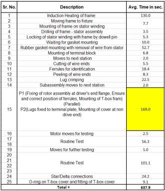 P2willstartoperationnumber16(i.e.,Lugsscrewedtothe terminal plate) simultaneously P1 will start operation number21(Fixingofrotorassemblyatdriver'sendflange). Operationnumber16willconsume120sec.andoperation21 willconsume37sec.Therefore,P1willbefreeforabout = (120 37)=83seconds.Inthistime,P1willperformoperation number15forthenextmotorwhichwillconsumeabout25 sec.Therefore,thetimeremainingforP1willbe=(83 25) =58 seconds. Now, for the remaining time, person P1 can perform auxiliary tasks like, installing necessary stickers,