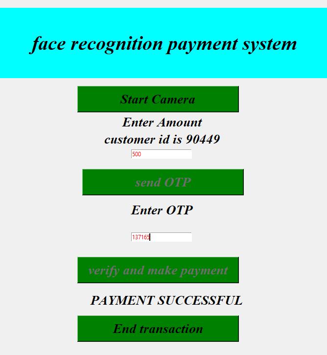 We have implemented transaction processing system using facial recognition with help of Haar Cascade and LBPH algorithms. Use of OTP further secures the process of user authentication. The whole system is user friendly and works efficiently with very little error if any. More featurescanbeincludedinfuture