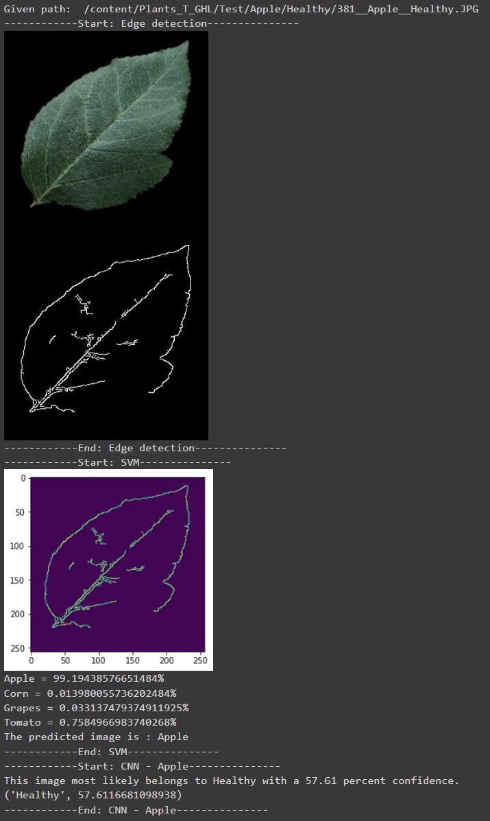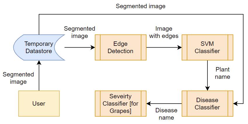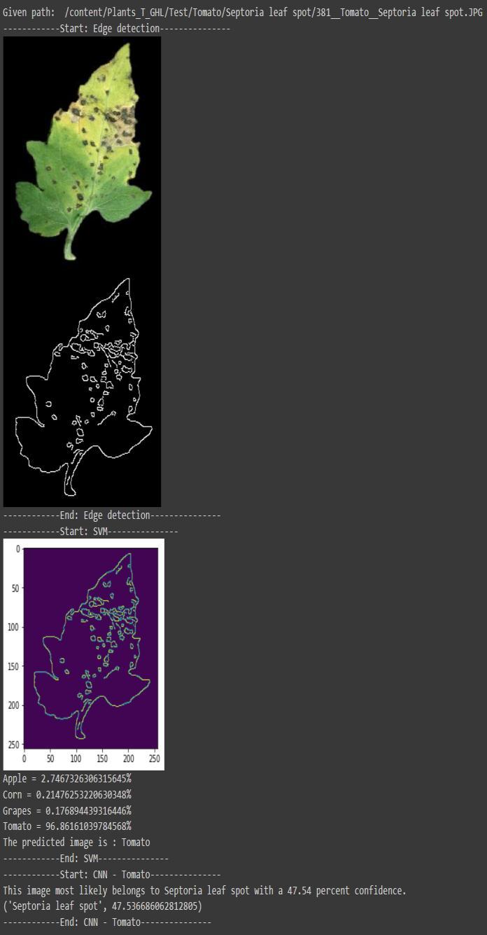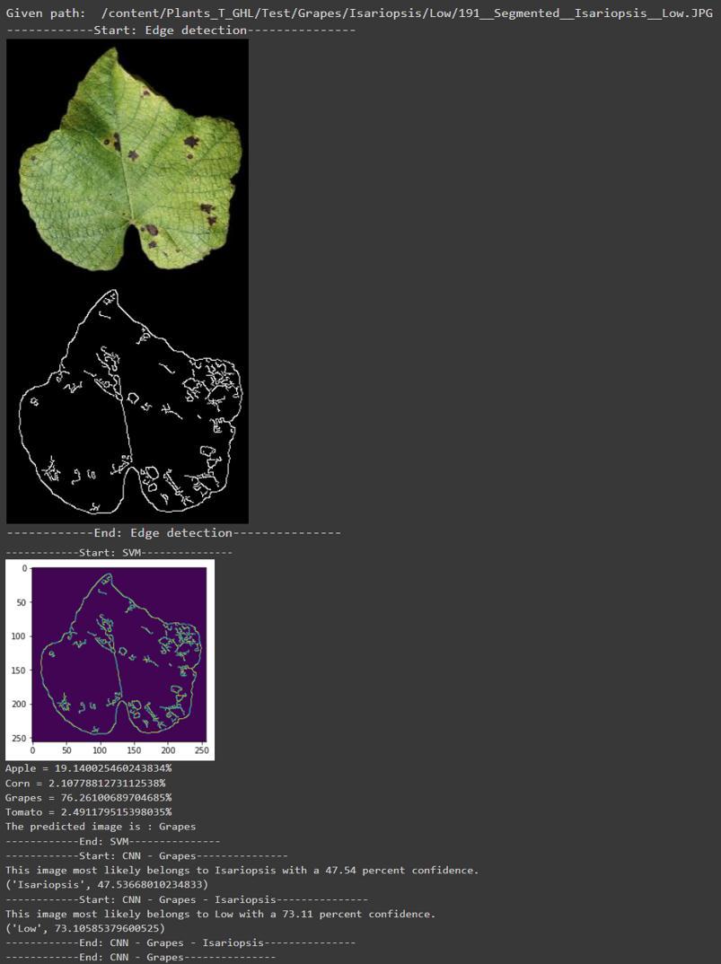 Theproposedmodelisdividedintothreemodulesnamely, identification of the plant, classification of disease, and classification of severity. In the plant classifier module, a segmentedimageisgivenastheinputwhichfirstdetectsthe edgesintheleafimageusingCannyEdgeDetectionmethod. Then the image is processed through SVM classifier for identification of plant. Deep learning methods are used in diseaseclassifiermoduleandseverityclassifiermoduleto providebetterperformanceandaccurateresults.Figures2, 3,4and5displaytheoutputofthemodel.