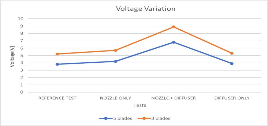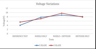 Herethereferencetestorthetestwithouttheadditionany nozzleordiffuserhastheleastoutput.Withtheadditionof nozzle,amarginalincreaseinvoltageoutputisseen.Diffuser alonehaslesseroutputthannozzlealonesincetheintakeof airislessinthebeginning.Theintakeofwindisincreased