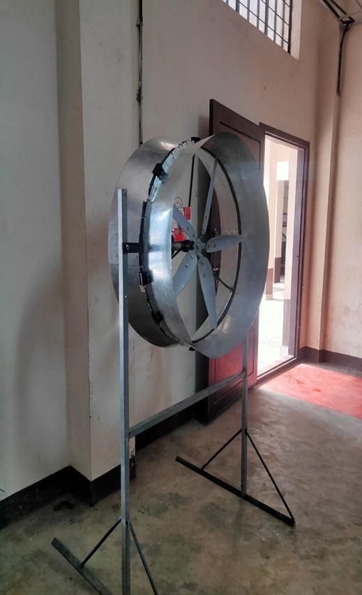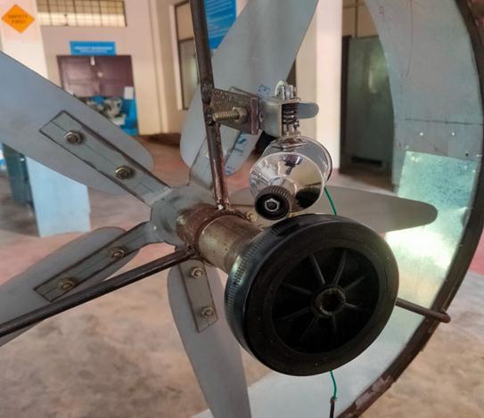 Theshroudwasclippedontotheouterperiphericalringof thearrangementtocompletethe fabrication work.A bulb wasconnectedtothedynamousingaregulatorIC(IC7305) in series with two resistors in parallel (630 ohm) to the dynamo. The completed fabrication of shrouded wind turbineproducinganoutputusingdynamoisshowninfig3.