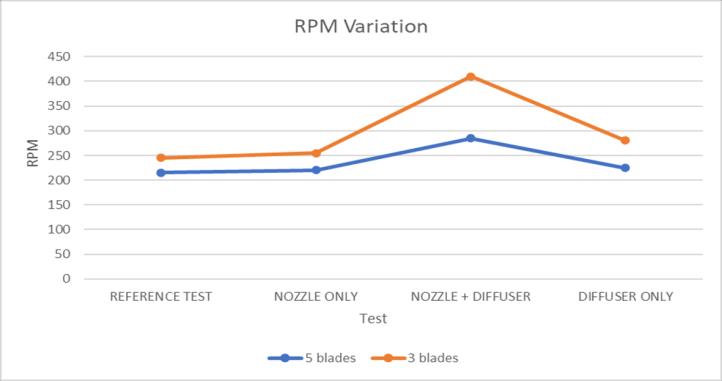 Here the reference test has the least output. With the additionofnozzle,amarginalincreaseinrpmoutputisseen. Diffuseralonehaslesseroutputthannozzlealonesincethe intakeofairislessinthebeginning.Theintakeofwind is increasedwithnozzle.Thediffuseralonearrangementcan onlyreducethepressurebutthepressurereductioncanonly