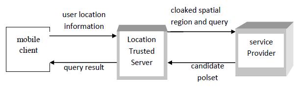 (ii) Privacy of mobile user: Currently many mobile usersare accessing Location based services (LBS). LBS have abig problem related to privacy of user because it offers the data of the user about current location. This issue becomes very massive if confidential data of user isdisclosed to any untrusted individual Location Trusted Server (LTS) has solved this problem. LTS is shown infig.2. When a user wants to access Locationbasedservice, it will give its location to Location TrustedServer (LTS). Now it is task ofLTStonotshowuserdataby ‘Spatial Cloaking’. When cloaked region is created, LTS transferred spatial cloaking to LBS providers Then after LBS Service provider processed the and queries send back these query outcomes to LTS which willtransferfinalresulttouser.
