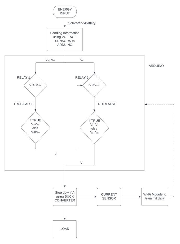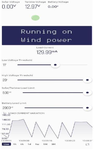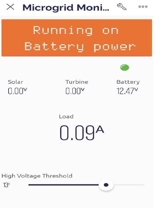Theusercansethighvoltage,lowvoltagelimitsintheBlynk app.Alongwiththat,the maximumloadthata sourcecan withstandisalsospecifiedbytheuser.Whenthevoltageofa sourceisbelowthelowvoltagethresholdorabovethehigh voltage threshold for the particular source, the microcontrollerselectsadifferentsourcebyswitchingthe load through relays. In case, neither solar nor turbine has sufficientvoltage,theloadisswitchedtothebatterybackup.