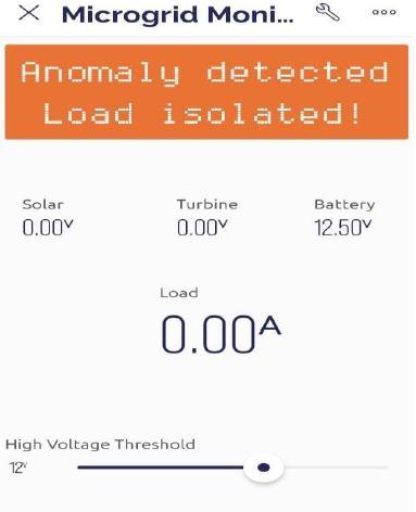 TheBlynkapplicationallowstheusertosetvaluesforhigh voltagethreshold.Inonecase,highvoltagethresholdwasset to12V.Whenbatterysuppliedavoltageof12.50Vthereby exceeding the set limit, the load was isolated and an alert messageof“Anomalydetected,loadisolated”wasnotifiedto userinBlynkasshowninfigure16.