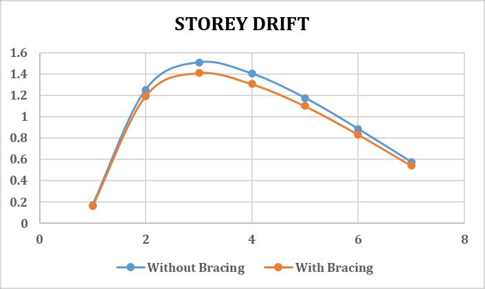 Fromthebelowdataithasfoundthatthestoreydriftofthe structurewiththein planehorizontalbracingdecreaseinthe range of 10% as bracing provide lateral stiffness to floors. Henceitperformsbetterduringseismicactivity.