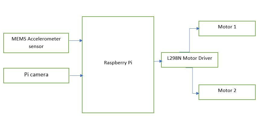 TheblockdiagramoftheproposedprojectisshowninFig 1.TheproposedworkusesRaspberryPi4with4GBRAM whichistheheartofthesystem.ThePicameraattachedto it captures the face region of the person. The various operations are performed on this image to get the output signal. The Raspberry Pi then analyses the output signal basedontheeyespositionandsendsthe controlsignal to themotordrivercircuit.Themotordriver circuitcontrols the movement of wheels either in a clockwise or counter clockwise direction or stops. The accelerometer sensor in the mobile phone detects the movement of the hand and calculates corresponding tilt angle and is provided to the Raspberry Pi which then sends the control signal to the motor driver. The motor driver circuit controls the movement of wheels either in a clockwise or counter clockwise direction or stops. Two separate motors are mountedoneachwheel. Fig 1:Blockdiagram