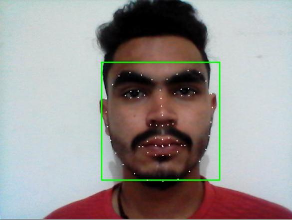 a. Face detection: The facial key point detector takesa rectangular object of Dlib module as input, which is nothingbutco ordinatesofface.Inordertofindfaces,Dlib is used, which is an inbuilt frontal face detector. Initially the ādlib.get frontal face detector ()ā will be used to detect the four corner coordinates of the face. It is a pre trained model which makes use of Histogram of oriented Gradients (HOG) and Linear SVM techniques. HOG is used primarily as an object detector. It provides information about pixel orientation and direction .The Linear SVM method is used to differentiate and group similar objects together. The Dlib provides both of these methods combined for face detection. The Fig 2 is obtained by joiningthecoordinatesobtainedfromthefunction.