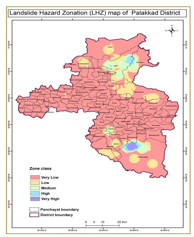 Landslideriskzonemapiscreatedbycombiningtheother mapsusingGIStools.Itisthenclassifiedintofiveclasses: verylow,low,moderate,highandveryhigh. 4,480km2 is thetotal area of Palakkaddistrictoutof which29.49km2 area falls under the very high risk zone. 58.01 km2 area falls under high risk zone, 191.24 km2 area falls under moderate zone and 562.46 km2 falls under low risk zone and3640km2areainverylowzone