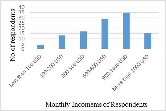hadamonthlyincomeofbetweenUSD100 200,66(32%)of respondents had a monthly income of between USD 300 500. This is the majority, 55(27%) of respondents had a monthly income of between USD 600 800, 15(7%) of respondents had a monthly income of between USD 600 800. Figure 3.6 showed that the monthly income of the respondentsinthisstudy.