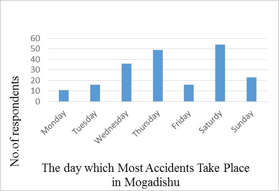 It's crucial to know the day of the week that most traffic accidents occur in the city and knowing this will give accidentinformationtobothroadusersandthepolice.This questionwasaddedtolearnthedayoftheweekthatmost accidentshappeninMogadishuCity.Theresearchfindings showedthat,outof205,11(5oftheserespondentssaidthat thedayofthe weekonwhichmostaccidentstakeplaceis Monday, 16(8%) of these respondents said it is Tuesday, 36(18%) of these respondents said that it is Wednesday, 49(24%) of these respondents said that it is Thursday, 16(8%)oftheserespondentssaidthatitisFriday,54(26%) oftheserespondentssaidthatitisSaturday. Table3.6and Figure 3.12 show that the day of the week that most accidentstakeplaceinMogadishucity.