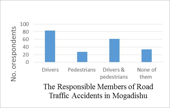 Recognizing the responsible members of road traffic accidents in the city will help the government to pay Pay special attention to these members. This question was introduced to evaluate the responsible members of road trafficaccidentsinMogadishu.Theresearchfindingsshowed thatoutof205,83(40%)oftheserespondentssaidthatthey said that the drivers are responsible for the road traffic accidentsinMogadishu.Thatisthemajority,27(13%),said that the pedestrians are responsible for the road traffic accidents in Mogadishu. In Somalia, 61(30%) of these respondents said that the drivers and pedestrians are responsible for the road traffic. Table 3.4 and Figure 3.10 showedthattheresponsiblepartiesinroadtrafficaccidents inMogadishu.