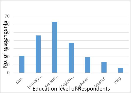 Knowledgeisanimportantfactorfordealingwithdailylife obstaclesand forfindingouttheexactreasonsbehindthe problem,whichcanhelptheresearcher gathermorefactual information about the field. In this study, the research findingsshowedthat 21(10.2%)ofrespondentswereNon meaning that there was no educational history, 41(20%) primary level of respondents, 68(33.1%) majority level of respondents,37(18%)diploma,16(8%)bachelor,13(6.3%) master,9(4.4%)ofrespondentswerePHDholders.Figure 3.3showsthedifferinglevelsofrespondents'education.