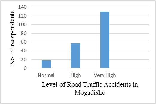 ToknowThelevelofaccidentsinthecityshouldallowthe researchers and the relevant agencies in the city of Mogadishutoalertpeopleaboutthepossibilityofaccidents astheyrise.Sothisquestionwasintroducedtoassesstraffic accidentsatalevelinMogadishucity.Theresearchfindings showedthatoutof205,18(9%),oftheserespondentssaid thatthelevelof 57(28%),oftheserespondentssaidthatthe level of accidents is high, and 130(63%) of these respondents said that the level of road traffic accidents is veryhigh. Table 3.1and Figure 3.7showthelevel ofroad trafficaccidentsinMogadishucity.