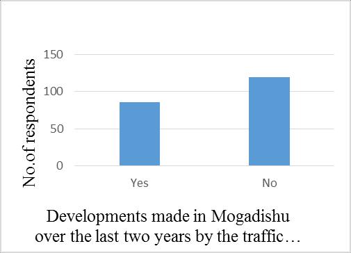 This question was added to assess developments made in Mogadishu over the last two years by the traffic police department.Theresearchfindingsshowedthat86(42%)of theserespondentsoutof205said"Yes," whichmeanspolice made tangible developments towards traffic accidents in Mogadishucity,while119(58%)ofthoserespondentssaid "No," which means police did not make any tangible developments towards road accidents in Mogadishu, Somalia.Figure4.16belowshowsthatifanydevelopments weremadebythetrafficpolicetoimplementtheroadsafety programs.