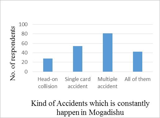Knowingthekindsofroadtrafficaccidentsthatalwaysoccur inthecitywouldprovidethegovernmentwithasolutionto thisproblem.Andthisquestionhasbeenaskedinorderto figureoutwhatkindofroadtrafficaccidents alwayshappen in Mogadishu. Research findings showed that out of 205, 18(9percent)oftheserespondentssaidtheroadaccident levelisnormal,57(28percent)ofthoserespondentssaidthe accidentlevelishigh,and130(63%)ofthoserespondents said the road accident level is very high. Table 3. 2 and Figure3.8belowshowthatthekindofRoadtrafficaccidents alwayshappeninMogadishucity.
