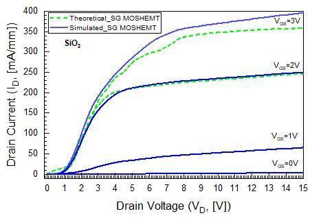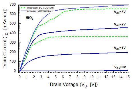 Inthissection,thesimulationresultsofSGdevicewiththree different oxide materials are compared and described. Figure2(a),2(b)and2(c)representagoodmatchbetween simulated and theoretical output current drain voltage characteristic curves (ID VD) of SiO2, Al2O3 and HfO2 gate dielectric MOSHEMT in linear scale for different gate voltages. The mobility of carriers, which is influenced according to the doping concentrations, is an important factorofthedraincurrent.