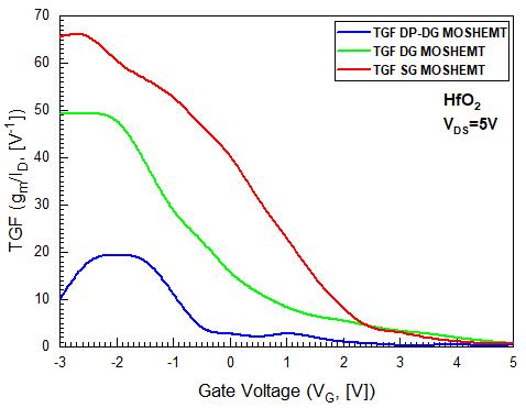 Figure (8), explores by varying in transconductance generation factor of HfO2 dielectric SG, DG and DP DG MOSHEMTsagainstgatetosourcevoltageatVDS=5V.Itcan benoticedfromthefigure(8)that,SGMOSHEMThashigher TGF,whichisconsideredtobehighlyefficient.HigherTGF leadsthedeviceperformancesincreasesandcanoperateat low supply voltage. For TGF between 10V 1 and 5V 1 variationswithVGSfrom 1Vto1.5Vtypicallyusedforanalog performance[20].