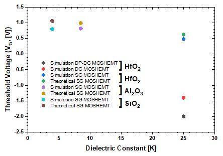 Figure 6, shows an appropriate match between the comparativesimulatedandtheoreticalthresholdvoltagesof SiO2,Al2O3 andHfO2 dielectricsinglegateMOSHEMTs,HfO2 dielectricDGandDP DGMOSHEMTs.Itisobservedthat,SG devicestructureshavepositivethresholdvoltages,whereas DG and DP DG device posses negative VT. So, for normally OFF operations SGMOSHEMT structure istheappropriate choiceduetopositivethreshold.Aswecansee,ifdielectric constant increases threshold voltage decreases and hence, draincurrentalsoincreases[20].Infigure7(a),atVGS=3V, DP DGdevicehasthehighestdraincurrentof8000mA/mm andoutputconductanceof2300mS/mmascomparedtoDG MOSHEMT. At VDS=5V, figure 7(b) compares the transfer propertiesofHfO2 dielectricSG,DGandDP DGMOSHEMTs onalinearscale.Fromthisresult,theION/IOFFcurrentratioin DP DGMOSHEMTwassubsequentlyimprovedwhichclearly shows that the existence of dielectric pockets reduces the chargesharingattheinterfacesofthesource channelaswell asdrain channeland,consequently,theIOFF current[20].