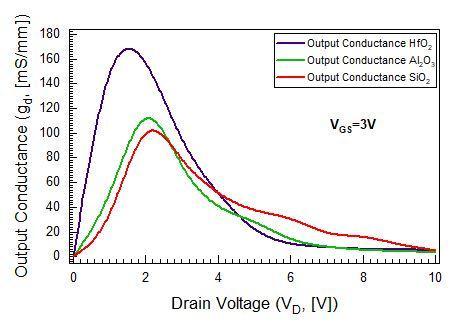 Figure 3 displays the drain conductance drain voltage characteristic curves (gd VD) of SiO2, Al2O3 and HfO2 gate dielectric MOSHEMT for VGS=3V. Maximum output conductanceatVGS=3Vis170mS/mmforHfO2gatedielectric MOSHEMT while for SiO2 and Al2O3, gdmax are 100mS/mm and115mS/mm.