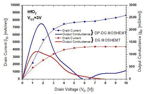 Fig 7(a):Comparative(ID VD)and(gd VD)characteristic curvesbetweenHfO2dielectricDGandDP DGMOSHEMTs