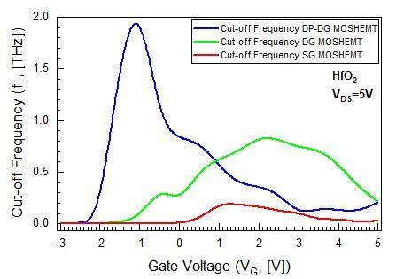 Fig 5:Comparative(fT VG)characteristiccurvesbetween SiO2,Al2O3,andHfO2 dielectricSGMOSHEMTs