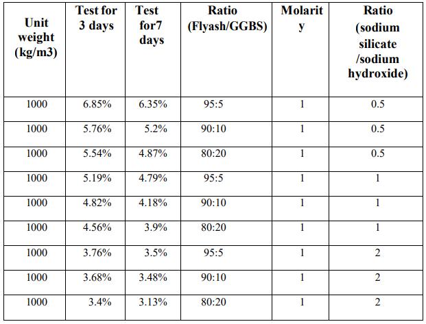 Water absorption is less than 7% for all samples withdifferentpercentagesofflyashto GGBS(95 5, 90 10&80 20%)anddifferentratiosofSSS/SHS( 0.5,1&2).