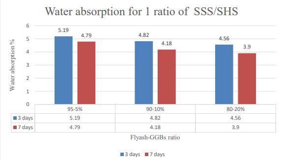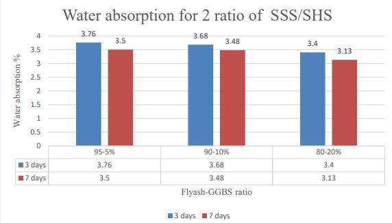 Heretheobservationshowsthatthewaterabsorptionisless than7%forallsampleswithdifferentpercentagesofflyash to GGBS (95 5, 90 10 & 80 20%) and different ratios of SSS/SHS(0.5,1&2)