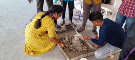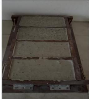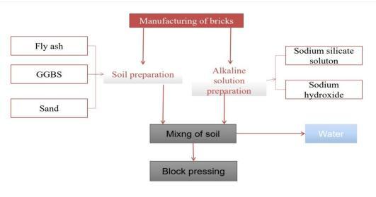 In this process, Rangan’s method was governed for manufacturingbricks.Thealkalinesolution,onedaybefore mixingthematerialsalkalinesolutionhastobedonewith sodium silicate solution and sodium hydroxide solution which work as an activator in geopolymer bricks manufacturing. After one day of alkaline solution preparation,soilpreparationhastobepreparedbydifferent proportionsofflyashandGGBSlike95 5%,90 10%,and 80 20%.Herethealkalinesolutionisaddedtothesoilmix. Afterthemixing,applygreasetothemoldsandthenfilled withthemixturewithpropercompactiontoremoveairgaps. Here230mmx110mmx70mmsizeofmoldsareused.