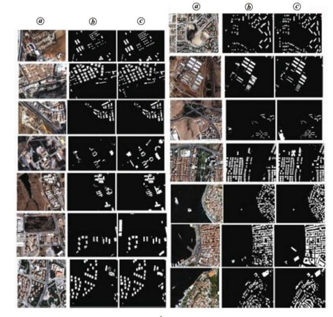 Fig 3: BuildingdetectionfromVHRmultispectralimages hasbeenmadepossibleviaacognitive basedautomated method.Resultsofcognitive basedmethodswhere(a) indicatesinputimages;(b)outputimagesand (c)referenceimages.