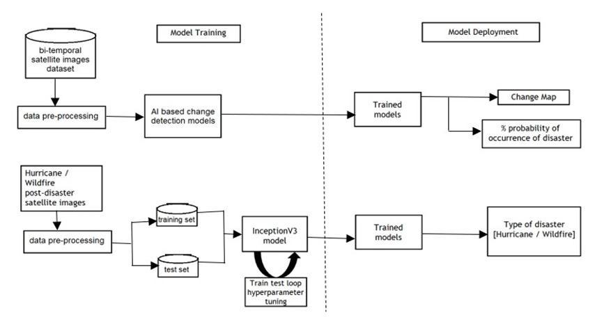 Themodelextractsfeaturesfromtwobi temporal satelliteimages.Thetwofeaturemapsarecomparedusing Reduced Sum of Squares (RSS) mathematical functions to generateachangemap,wherewhitepixelsrepresentchange and black pixels represent no change. A disaster's percentage occurrence is calculated as the percentage of whitepixelsinthechangemap.Thetransferlearning based Inception V3 model is trained to distinguish between hurricaneandearthquakedisastersbasedonsatelliteimages ofdisaster affectedareas.Foridentifyingdisasterbetween hurricane and earthquake, the VGG 19 based AI change detection model and the trained Inception V3 model are deployed. Figure 4 depicts pictorial representation of proposedsystemarchitecture.Afteruploadingbi temporal satellite images, the user receives a change map and a predictionofthepercentageofdisasteroccurrence,andifa disaster occurs, the type of disaster is predicted between hurricaneandearthquake.