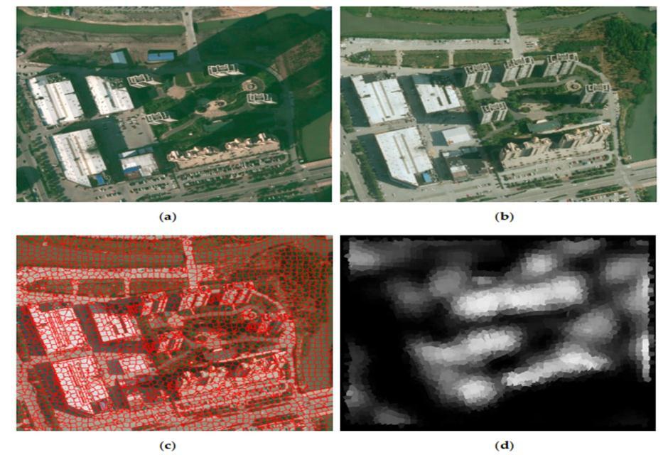 Fig 2: Bi temporalimages,thecorrespondingimage object,andchangeconfidencemap.(a)TheRGBaerial imageattimet1,(b)theRGBaerialimageattimet2,(c) superpositionofthebi temporalimage objectandthe RGBaerialimageattimet2,and(d)thechangemap.