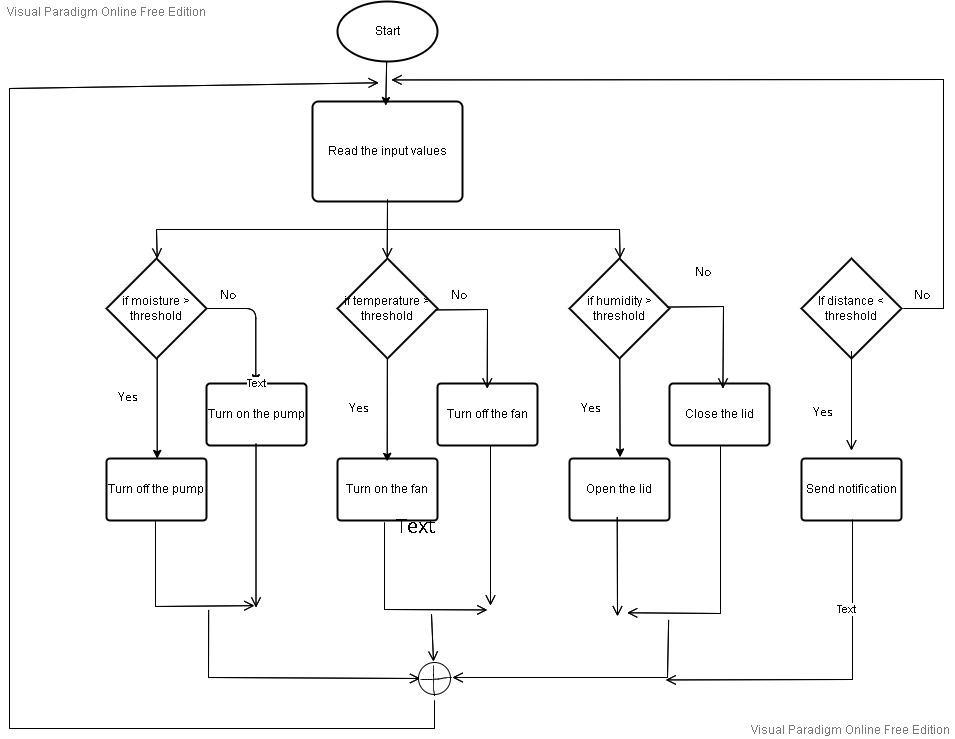 Thegreenhouseisbuiltusinggatesheetwhichabsorbsthe inputsolarradiationsanddoesnotletitescapethehouse which provides good warmth inside the greenhouse. The various sensors and the respective actuators are placed inside the greenhouse. The flow of working is shown in figure2.