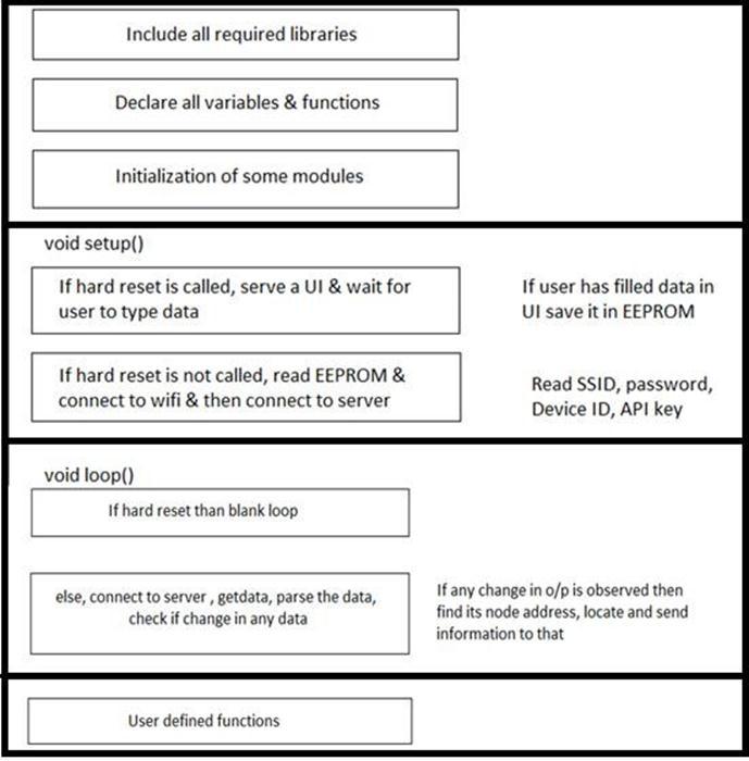 Thediagrambelowistoexplainthestructureofthecode, thoughthebelowrepresentationisnotthealgorithmorthe flow chart of the code running on ESP 2866 but it will definitely help understand the logic of our code. The structureofthecodeisshowninfigure3.