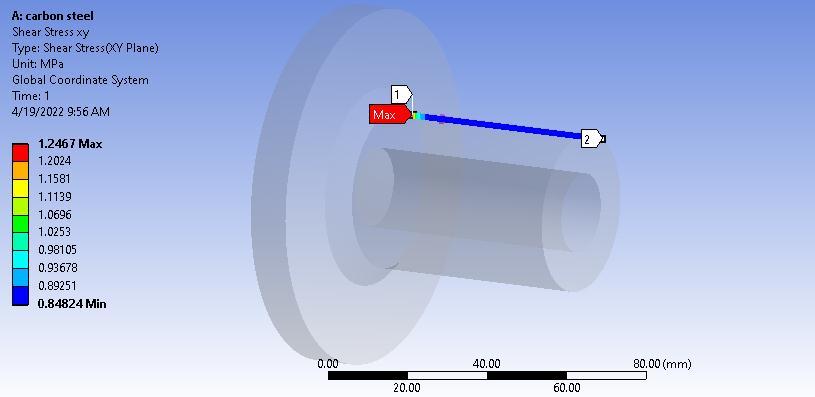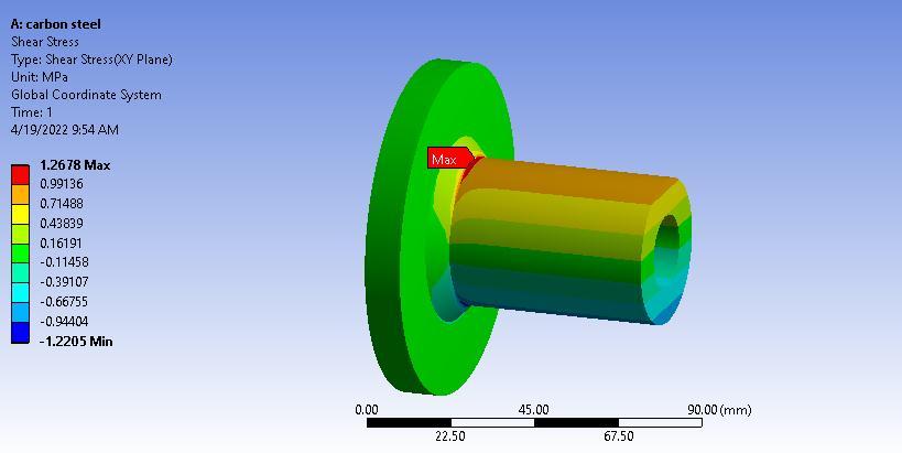 ThecarbonsteelweldjointisthesubjectoftheFEAanalysis. The shear stress plot for a carbon steel weld is generated and can be seen in figure 1.2678MPa. It is largest at the corners(theredzone),anditdecreasesalongthelengthof thetube.