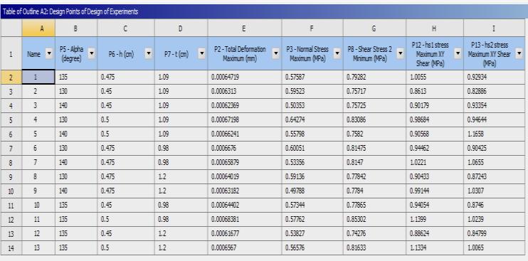Using Taguchi response surface (DOE) method involving centralcompositedesignschemevariousdesignpointsare generated.Thestress,deformationcorrespondingtothese designpointsareevaluatedfromFEAanalysis.Thecompiled results are shown in table 5.2 above. The maximum and minimumvaluesobtainedfromdesignofexperimentsare shownintable5.3below.