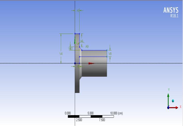 TheCADmodelofgeometryisdevelopedasperliterature [27] using ANSYS design modeler. Initially sketch is developedasshownbybluecolouredcrosssectioninfigure 4.1above.Thedimensionsaredefinedaspertable4.1above. Thesketchisthenrevolvedto3600 angletodevelopedfull model.