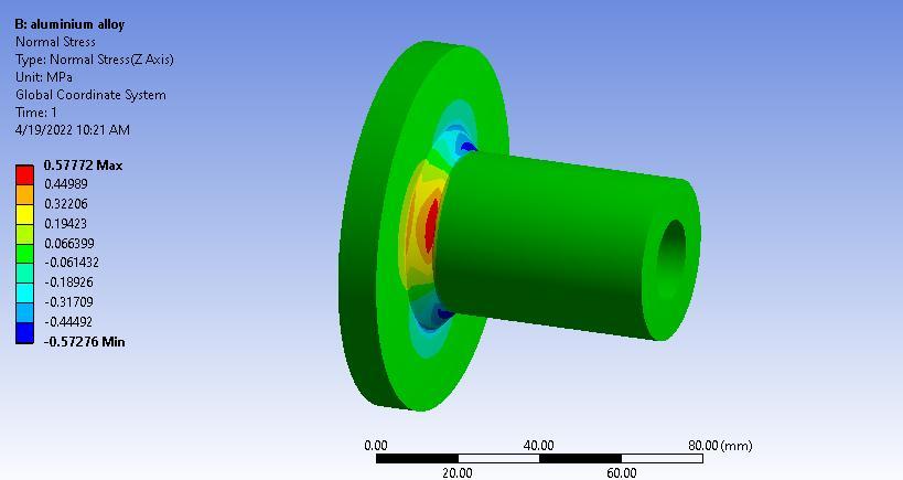 The normal stress plot is generated for carbon steel tube flangeweldjointasshowninfigure5.9above.Themaximum normalstressof.5777MPaisobservedattheintersection.