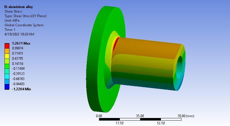 TheFEAanalysisisconductedonaluminiumalloyweldjoint. Theshearstressplotisgeneratedforaluminiumalloyweld as shown in figure 1.2671MPa which is maximum at the cornerregions(redcoloredregion)anditreducesalongthe lengthoftube.