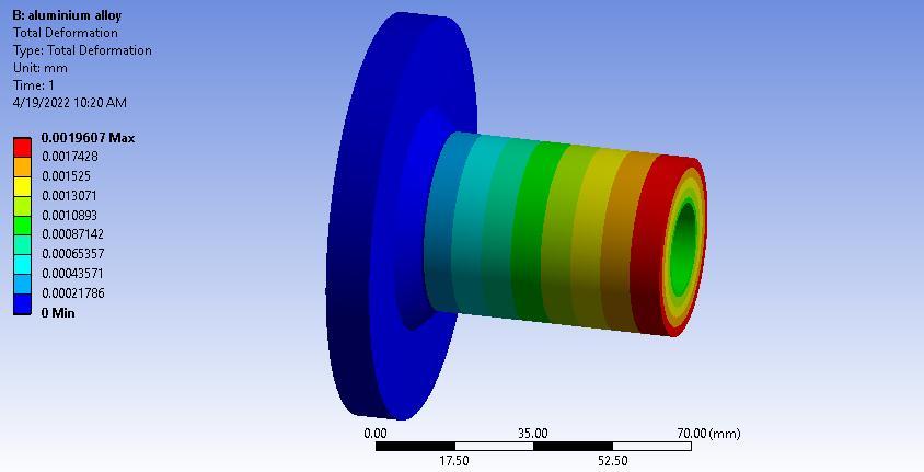 The maximum deformation is observed at the free end of aluminiumalloytubewithmagnitudeof.0019607mmandit reducestowardsthesupportedendwhichisshownindark bluecolor.