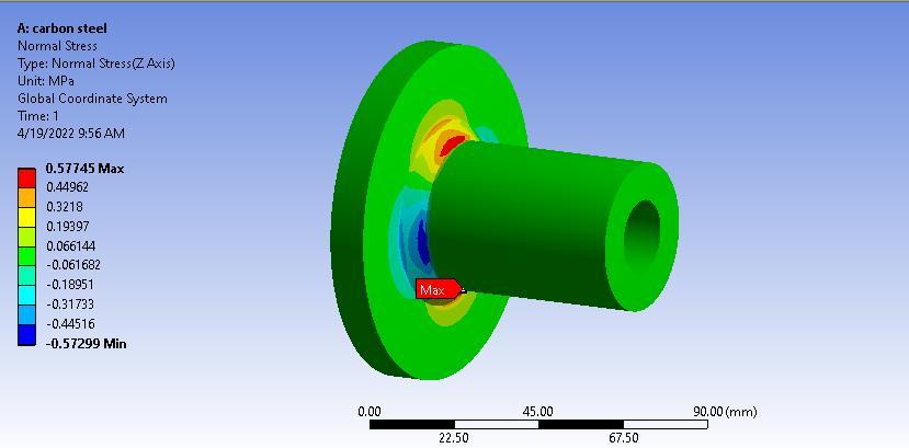 The normal stress plot is generated for carbon steel tube flangeweldjointasshowninfigure5.9above.Themaximum normalstressof.5777MPaisobservedattheintersection.