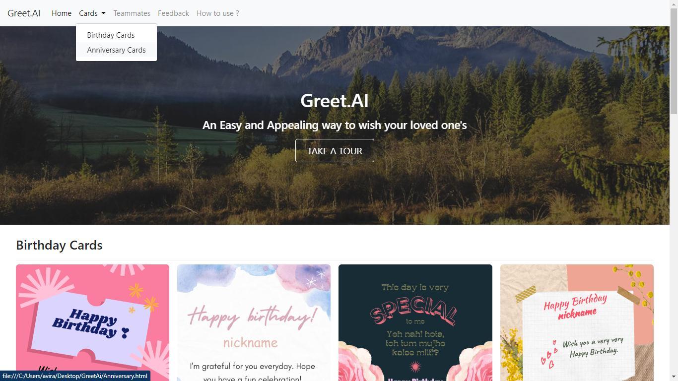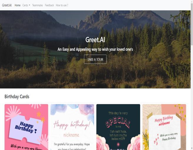 Firstofall,userhastoopenanywebbrowserontheirrespectivedevicesi.e.,MobilePhone,Laptopetc.andopenourwebsiteby thelinkhttp://greetai.epizy.com/whichtakesyoutothehomepageofthewebsiteshowninFig.2. The‘Homepage’whereyou canfindtheintroductionofthewebsite,hereyoucanseethetutorialvideoofthewebsiteandthecardsprovidedtotheusersfor sending.Hereweprovidealltheimportantsectionsofthesiteontheheadersection.