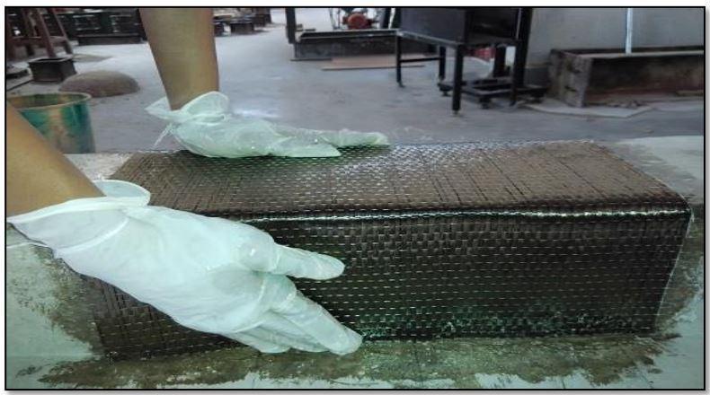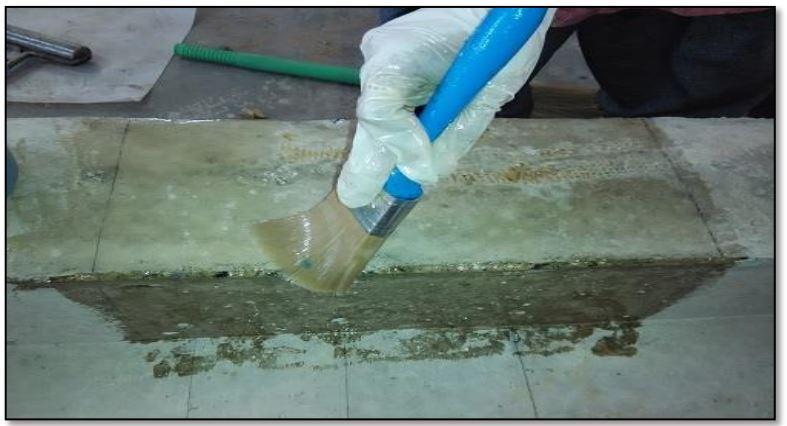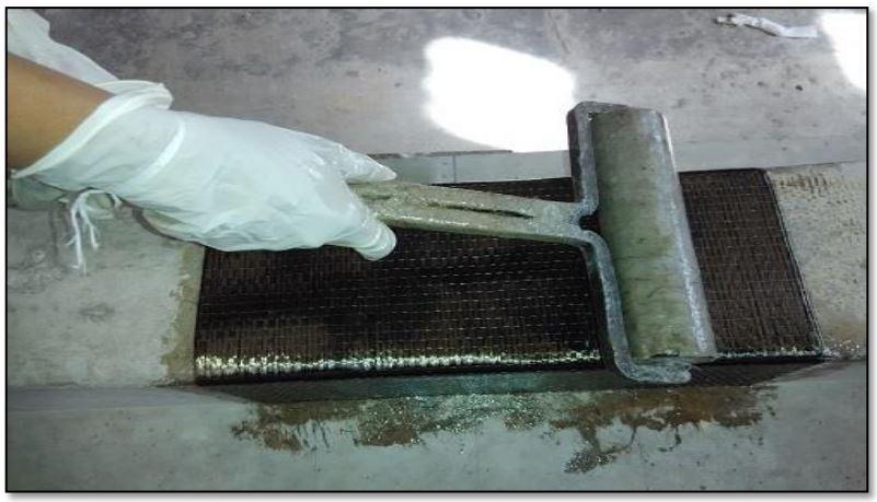 Oftheprocessofstrengthening,theFRPfabricsarebonded to the concrete surface using a good resin and hardener. First the bottom surface area of the beam is cleaned by removingallofthelooseparticles.Thenbymeansofcourse sandpaper,therequiredpartoftheconcretesurfaceismade uneven and most of the dirt and debris particles are removedwithanairblower.Theepoxyresinismixedand appliedonthenecessarypartoftheconcretesurfaceafter theplanningoftheconcretesurface.Theblendingisdonein a clear plastic container by taking 10 percent of hardener withrespecttothe epoxy resin andiscontinuedfor some timetogetauniformmixture.