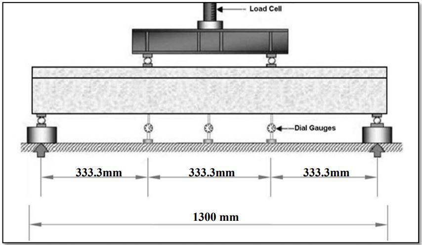 The arrangement of the 4 point static loading system is providedinFigure3.9.Theloadistransferredtoaspreader beambymeansofaloadcell.Thespreaderbeamisplaced abovethetestspecimenbymeansofsteelrollersplacedon steel plates bedded on cement to pay for an even levelled surface. The expected test loads should be carried by the loadingframeforallofthespecimenswithoutanydistortion. The beam specimen to be tested is placed on steel rollers placedbetween2steelplatesbearingleaving150mmfrom theendsofthespecimen.Therestofthe1000mmisdivided into3identicalpartsof333mmaspresentedintheFigure 3.9. The lines are drawn on the specimens to be tested at distances of L/3, L/2, & 2L/3 from the left support (L=1300mm).Thedeflectionofthespecimensisrecorded with the assistance of 3 dial gauges. 2 dial gauges are positionedunder2concentratedloads,i.e.,atL/3and2L/3 distancesaswellastheotherdialgaugeispositionedunder theCentreofthespecimen,i.e.,atL/2distancetomeasure thedeflections.