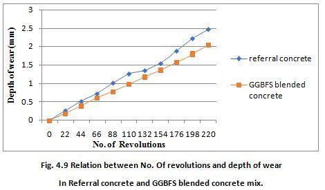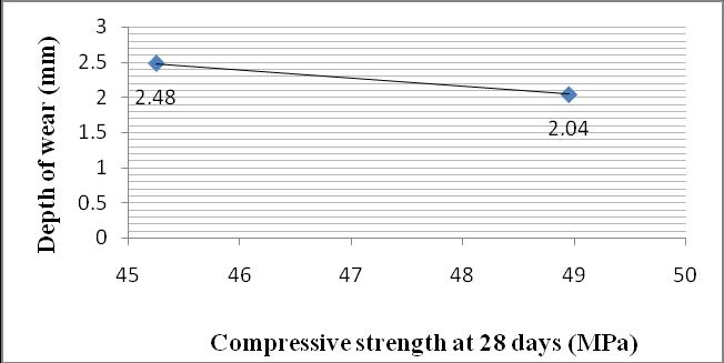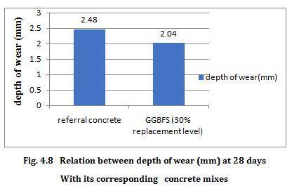 Thereisa relationbetweenthecompressivestrengthand abrasionresistance(depthofwear)asshowninfig.4.11.itis evidentfromthefig.4.11 thatabrasionresistanceisclosely relatedwithitscompressivestrengthasthe Thedepthof wear decreaseswithincrementincompressivestrengthof concrete mixes. The depth of wear has decreased from 2.48mm (Referral concrete, CS = 45.25 MPa ) to 2.04 mm (GGBFS blended concrete mix, CS = 48.95 MPa ) (30% replacementofOPCwith GGBFS)ishigherascomparedto referralconcretemixes.
