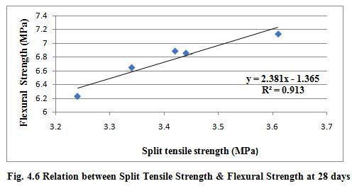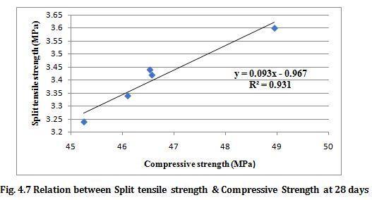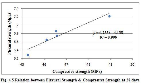 RelationbetweenFlexuralStrength &CompressiveStrength, Split Tensile Strength & Flexural Strength , Compressive Strength & Split Tensile Strength of GGBFS blended concretemixesdeveloped&plottedandaregiveninFigs4.5 -4.7.Regressioncoefficient, R2 valuesamongthedifferent strength parameter is found 0.906, 0.913 and 0.931 respectively. The high values of correlation coefficient indicatesthatthereisastrongrelationshipwitheachofthe strengthproperties(compressive,flexuralandsplittensile strength).