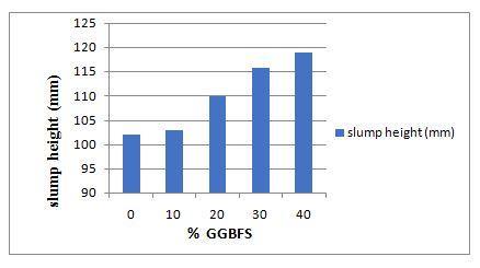 TheeffectofincludingGGBFS onworkabilityofconcreteis giveninFig4.1inwhichslump heightIs increasedupto40% replacementlevel.ThisisduetotheadditionoffinerGGBFS particles which causes the water demand decreased and improvingcohesivenessofconcretemixes.