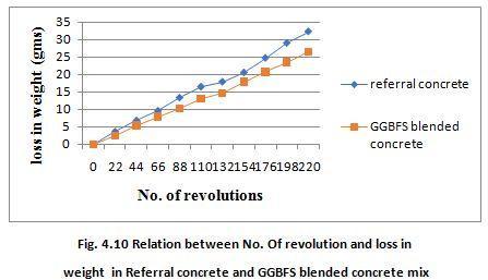 Abrasion resistance test is determined using tile abrasion machine as per IS code :1706 1972.for each samples of concrete mixes( referral and GGBFS blended concrete mixes), cubes of 70.6mm were casted and subjected to grinding path of abrasion machine after 28 days curing. Depthofcubesismeasuredat5points(fouratcornersand one at the center).weight of cubes and loss in depth of cubes(depthofwear) ismeasuredbeforeabrasiontestand recordedafterevery22setsofrevolutions.Thisprocessis repeatedtill220revolutions shownintable5. Theextent ofabrasionwasdeterminedfromthedifferenceinvaluesof thicknessmeasuredbeforeandaftertheabrasiontest.